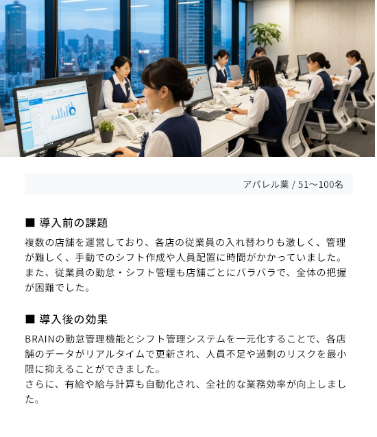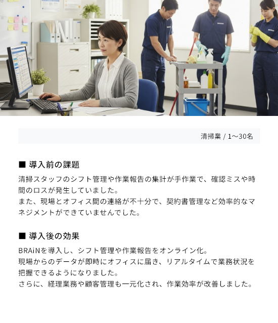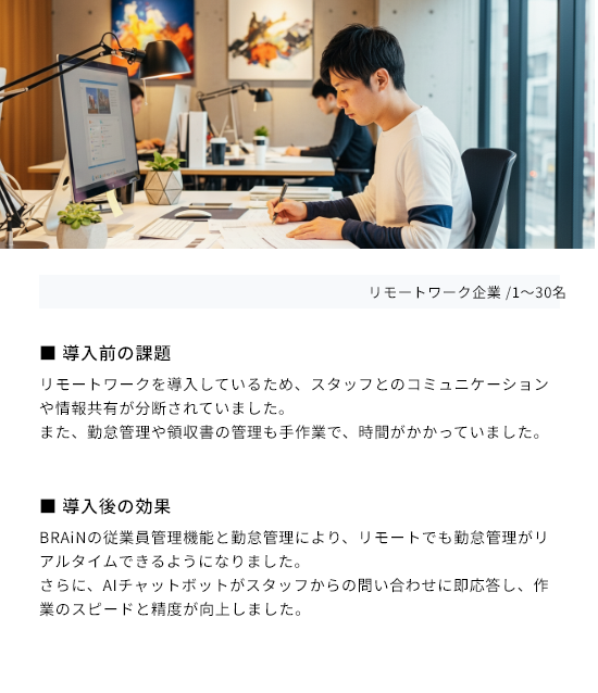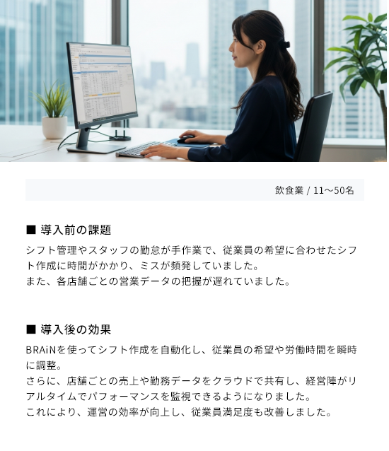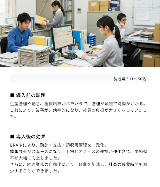 人事・勤怠・契約・経理・情報共有――バラバラだった業務をひとつにまとめ、 “現場が使えるDX”として多くの企業で成果を上げています。 ここでは、BRAINを導入した企業の課題と変化のストーリーをご紹介します。